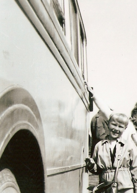 Bosse, 6 år, år 1952 fotograferad på Marsund färjan i Hammarland bredvid Chevrolet bussen ÅL 35 |