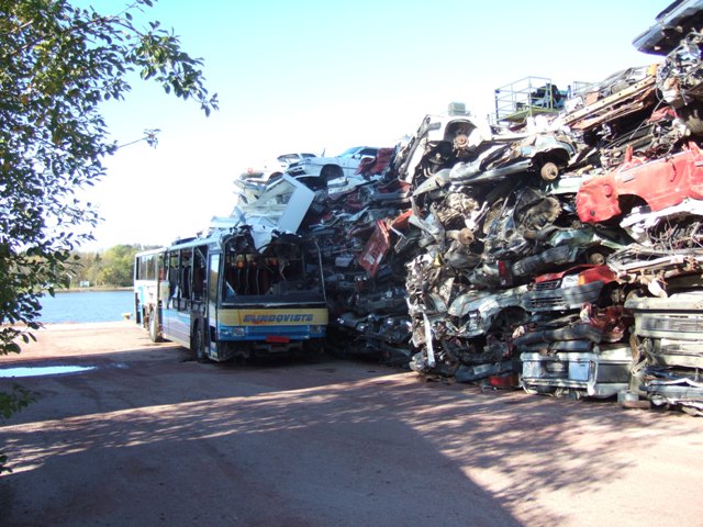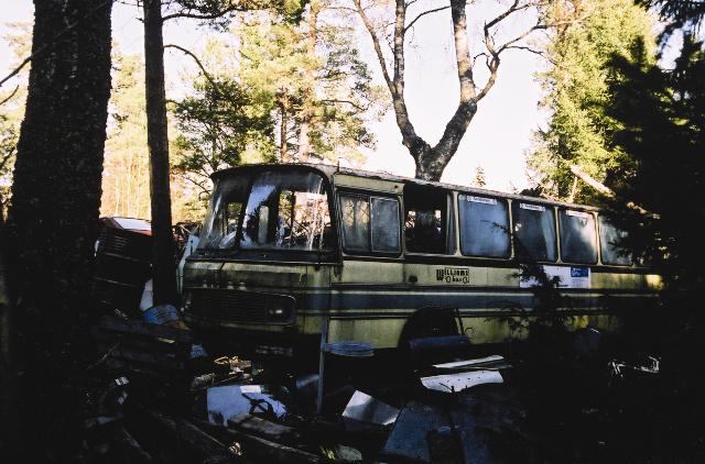 ÅLL 90 Sundqvist Buss årsmodell 1984 Bussen körde av vägen i Labbnäs, Geta den 14 januari 2004 på grund av halka. Bussen användes därefter av Västra Saltvik FBK som brandövningsobjekt. Den 8 oktober 2008 transporterades resterna av bussen med pråm från Klintkajen i Mariehamn till Estland. Foto: Bosse Ahlnäs, Mariehamn 7.10.2008 - klicka på bilden |