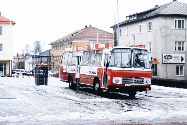 ÅL 8666 "Ylva" - 1978 Volvo B58-60-S1 / 6000, nr 12379 Wiima M 200-110, nr 4778, 45 sittpl, 25 ståpl, 16.225 kg ÅL 8666 02.10.1978 - 27.03.2007 - Röde Orm ÅL 8666 00.00.2008 - 07.10.2008 - Robin Sommarström, Mariehamn ÅL 8666 07.10.2013 - - Uffe Englund, Vårdö Bussen avställd 14.08.2015 Bussen finns år 2021 i Sund Fronten utbyttes till modell M301 efter en kollision år 1985 Bussen med ny front Foto: Röde Orms samling |