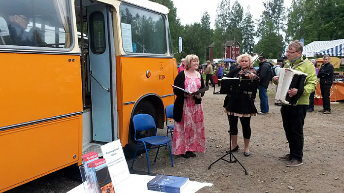 esittämässä Linjuripolkan. Yleisö istui viereisessä linja-autossa